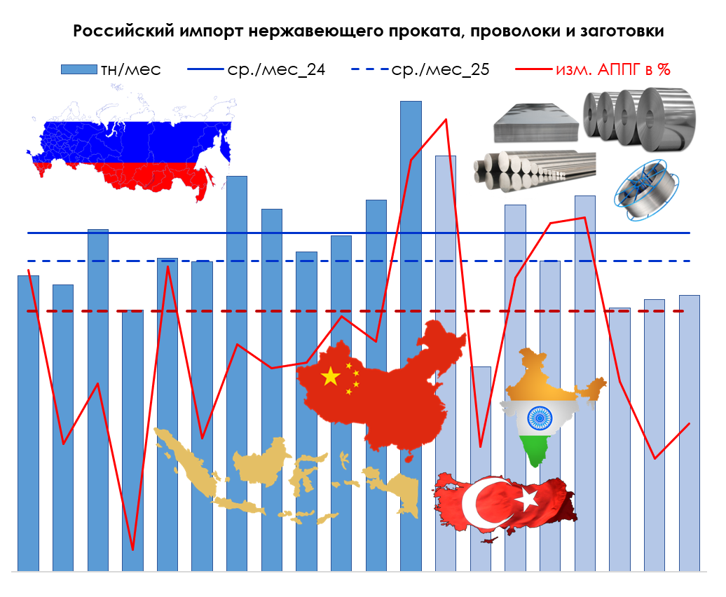 Во второй половине 2025 года поставки на российский рынок иностранной продукции из нержавеющей стали начали сокращаться. По данным ВТО, среднемесячный объем импорта продукции из нержавеющей стали (без учета б/ш и сварных труб) в Q1-Q3 2025 года снизился более чем на 8%.