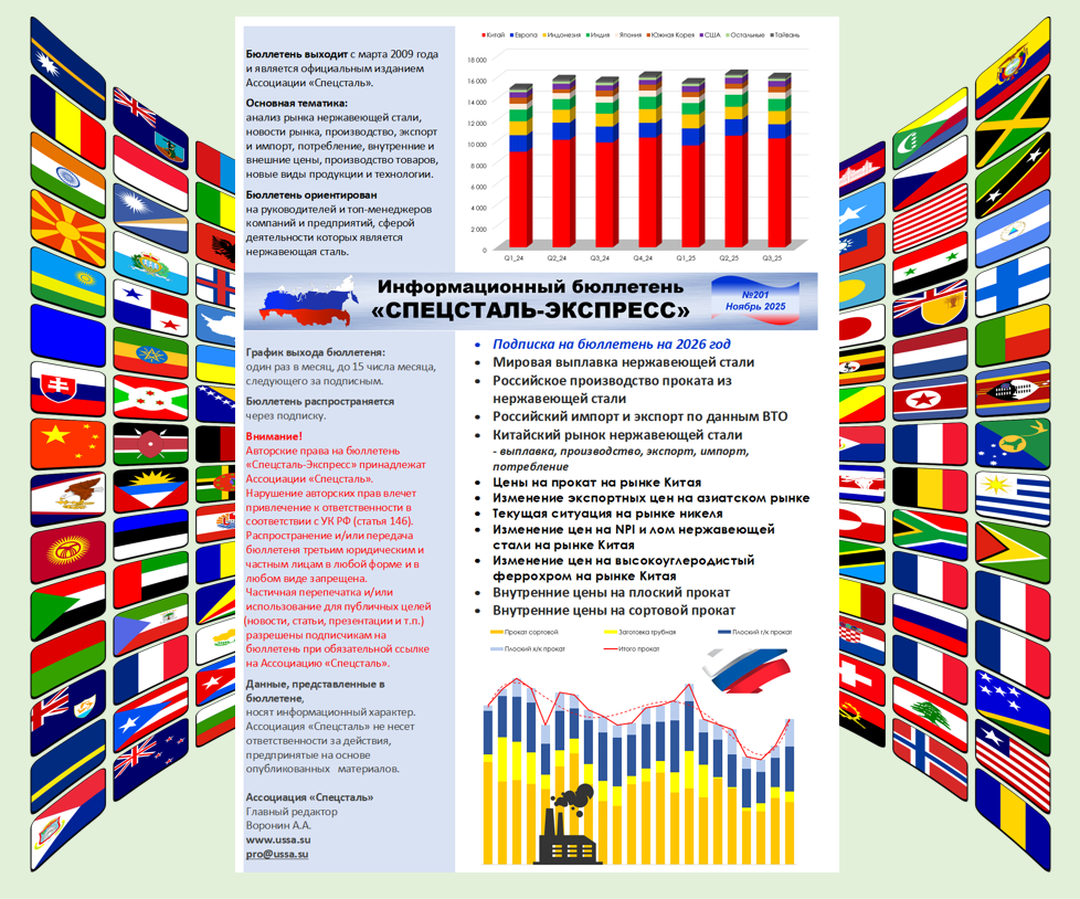 09.11.2025 Импорт Экспорт Производство Потребление Цены Сырьё Вышел октябрьский номер бюллетеня "Спецсталь-Экспресс" Главные темы выпуска: Выплавка нержавеющей стали в России Производство основных видов продукции Российский импорт нержавеющей стали Потребление нержавеющей стали в РФ Изменение экспортных цен...