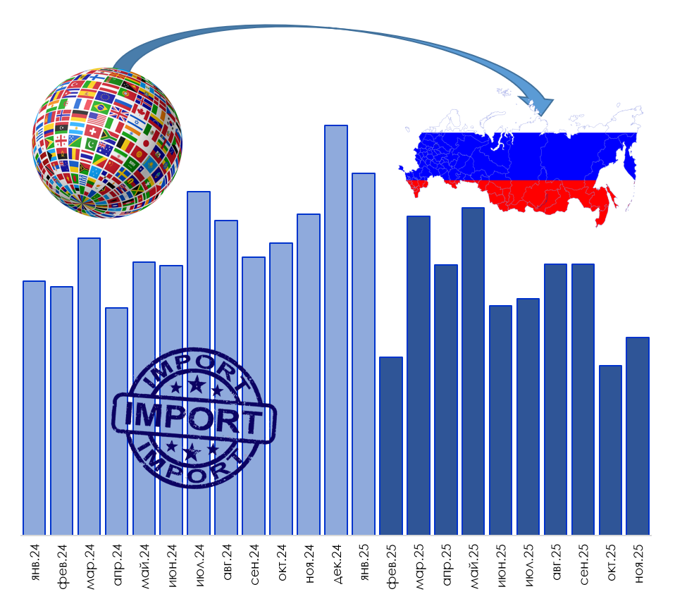 За 11 месяцев 2025 года, по сравнению с АППГ, объем отгрузки иностранной продукции в адрес российских компаний снизился: