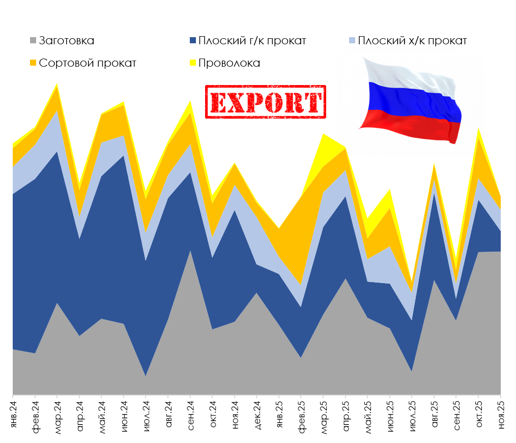 Структура российского экспорта была представлена: первичной заготовкой – 42,7% (11 мес. 2024 – 27,2%), плоским г/к прокатом – 26,4% (49,5%), сортовым прокатом – 14,7% (10,5%), плоским х/к прокатом – 11,7% (10,8%) и проволокой – 4,4% (1,9%).